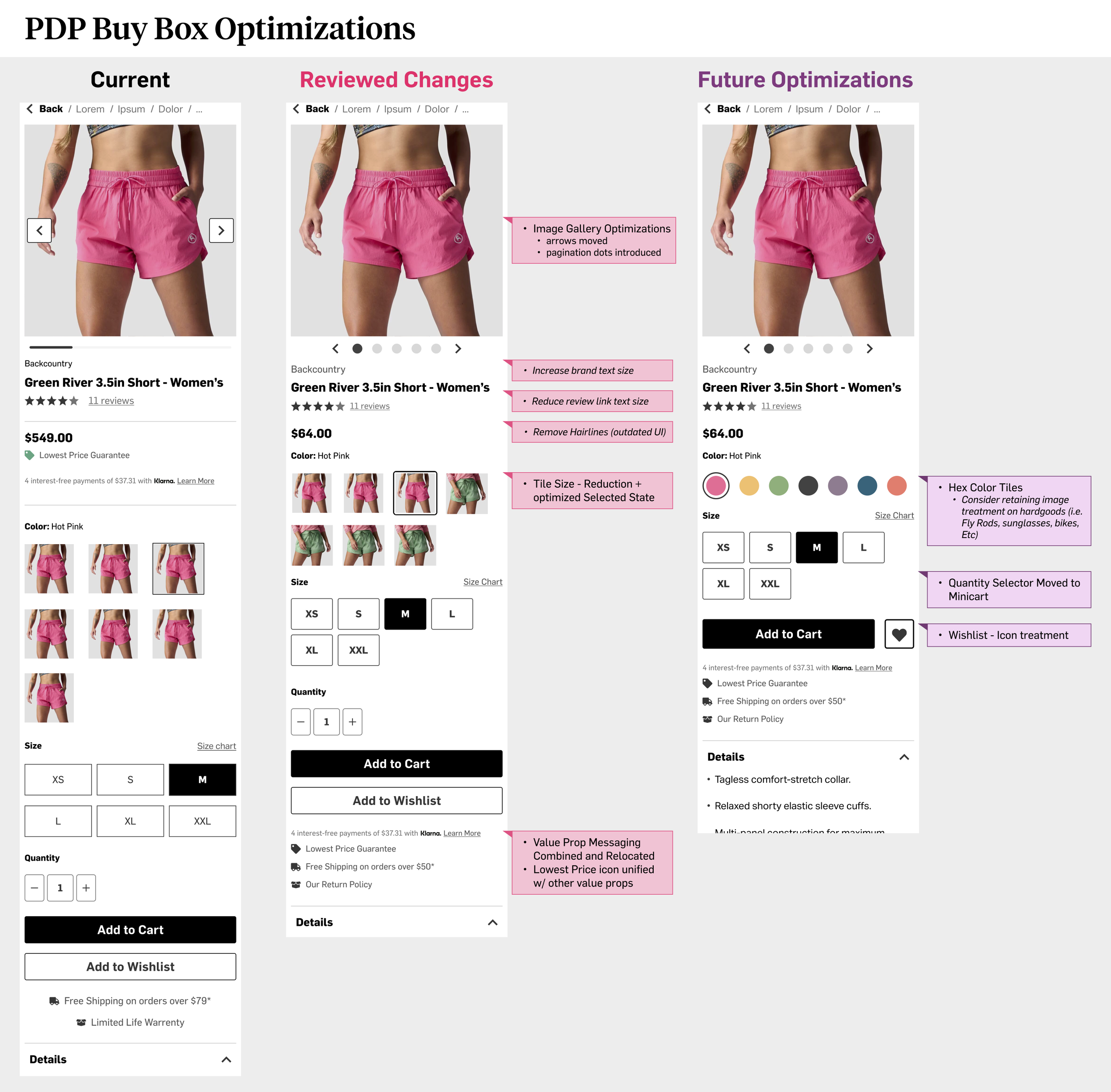 Optimizations PDF - single page view of current pdp, upcoming changes to the pdp, and a vision for the pdp for stakeholders.